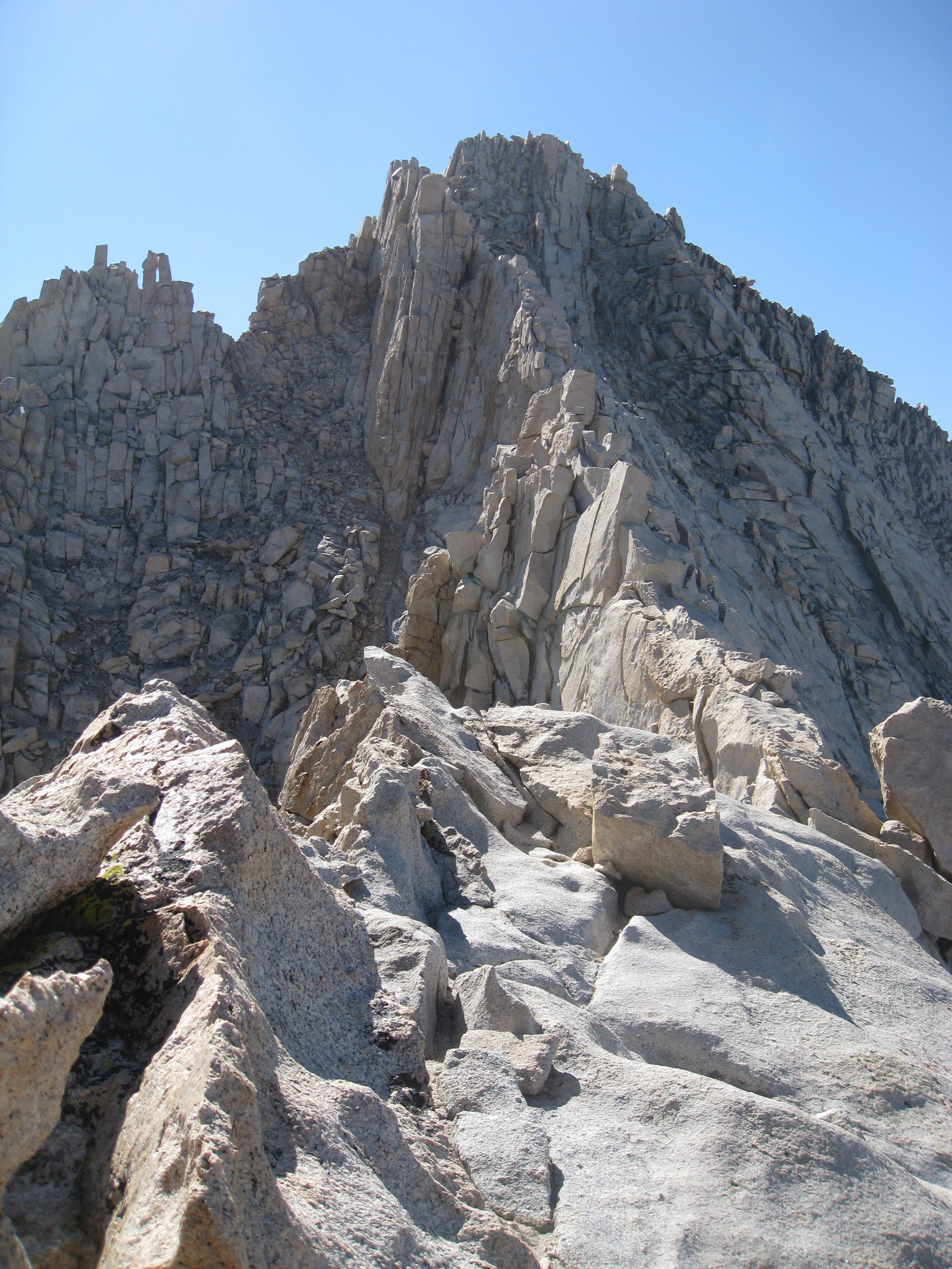 I’ve been back, on my own, to climb the East Ridge, which is a fun 3rd class ridge line. This line will take you to Russell’s second peak on the right. The approach is from Upper Boyscout Lake. Head up the broken cliff line to the east of the lake. Traverse to the far east side of the scree field and scramble up on whatever solid rock you can find. You’ll make your way back westward to the top of this ridge. If you glance to the East, you’ll see another mountain peak that you can go bag (the name escapes me right now). But, keep heading west and you’ll be able to see Russell’s ridge line from there. Try to stay true to the ridge. If there are any difficult sections, drop down to the east side and bypass it.
